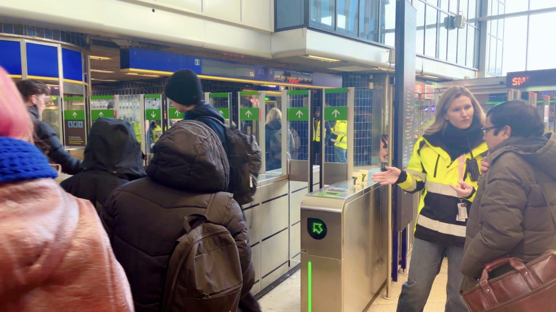 À Gullmarsplan, l’un des nœuds les plus touchés sur la ligne verte, des équipes de la SL sont désormais présentes sur le terrain pour assister les voyageurs. Leur mission :