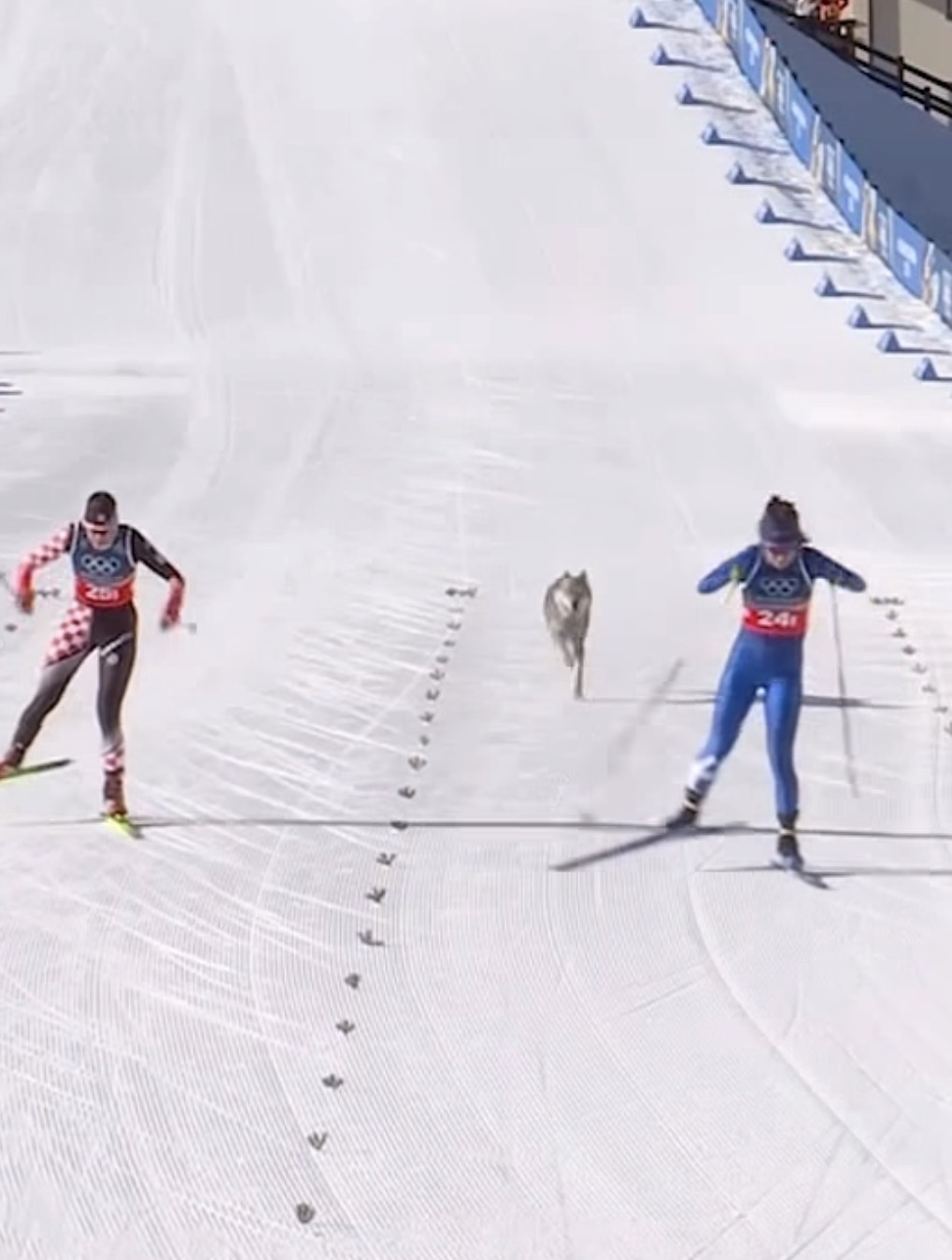 Nazgul est apparu dans une zone boisée du parcours, visiblement attiré par le bruit et le mouvement du peloton. Pendant plusieurs secondes interminables à l’échelle olympique l’animal a couru parallèlement aux athlètes, frôlant leurs skis. Les images télévisées ont montré des fondeurs hésitant entre rire et inquiétude, craignant une collision.